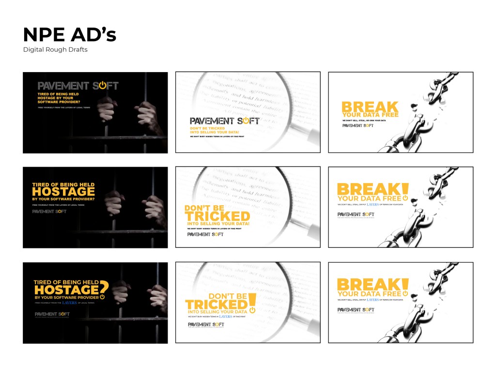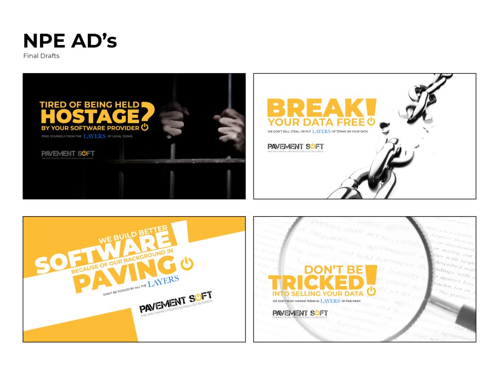 I was asked to create some advertisement for a screen display in a booth at NPE. These ad’s ran on a loop in between informational videos of the software. The goal of these ad’s were to make the potential client aware that one of the main policies of Pavements Soft is that we don’t own or sell any of the data they put into our software. I had two days to finish all four compositions.