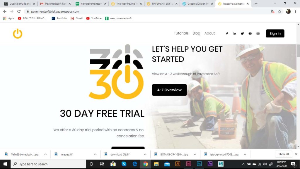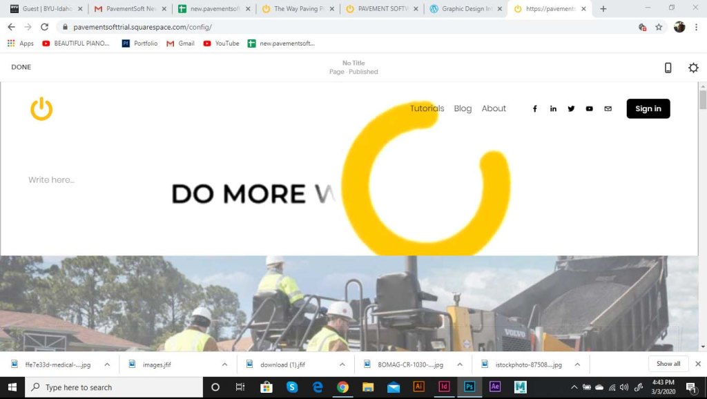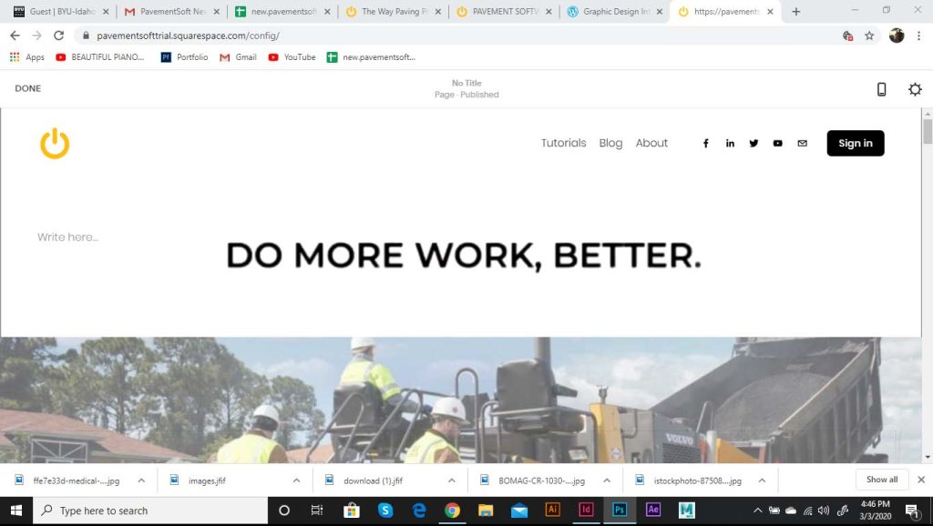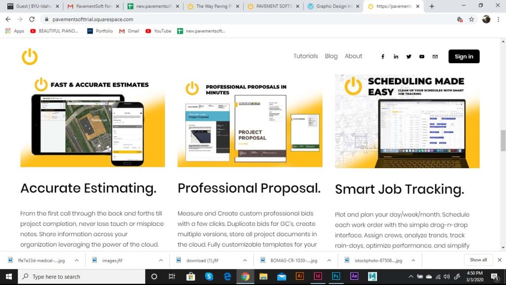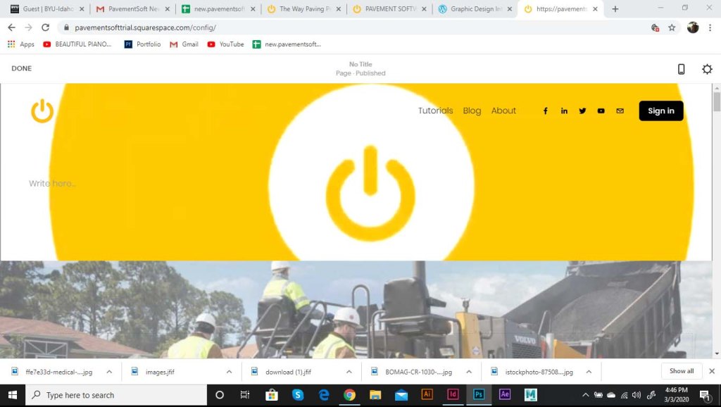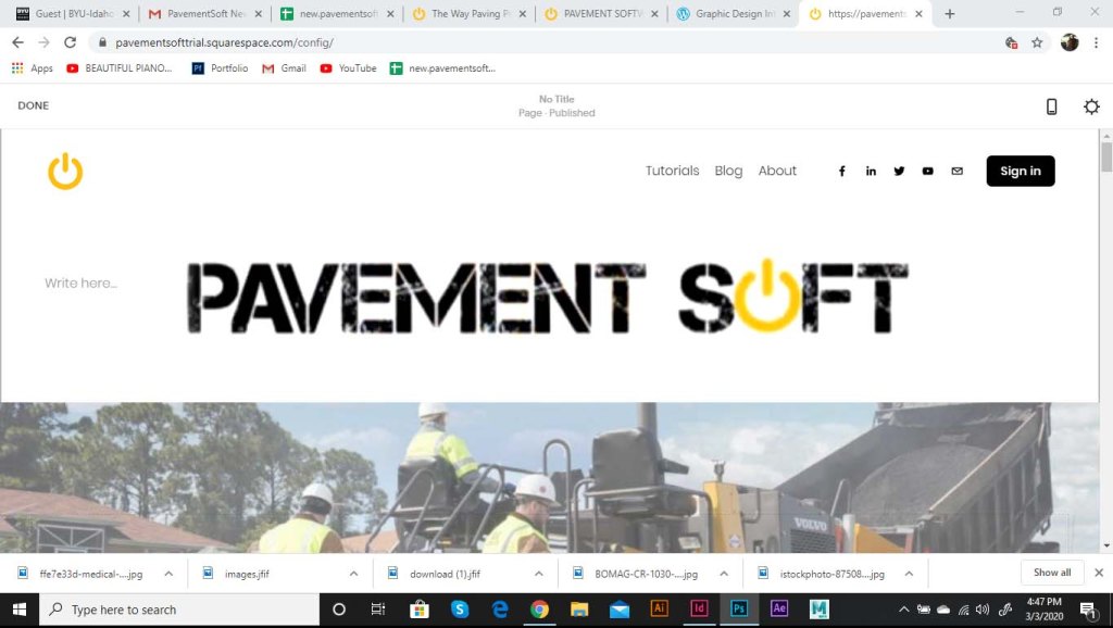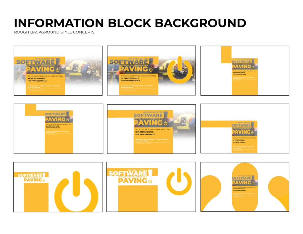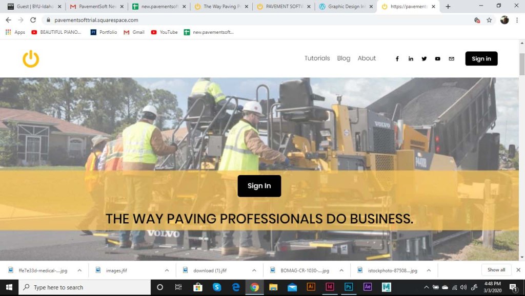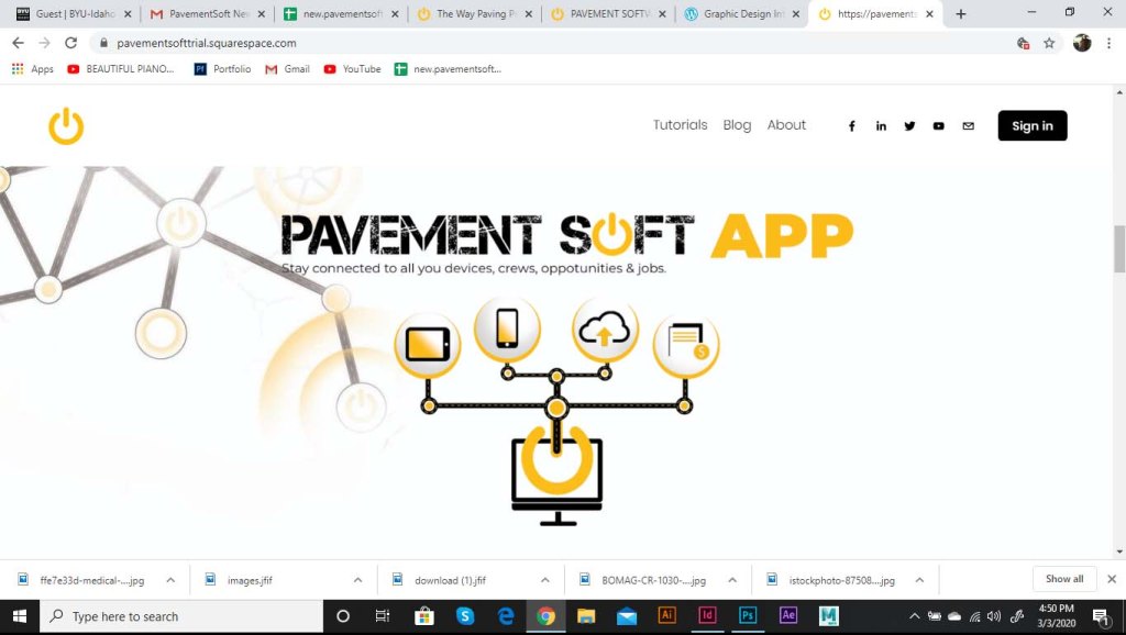 I was asked to start working on a landing page for the software. As part of the website, we wanted to include the logo opening up. The logo was to be animated, and the goal was to show the tech side of the pavement industry. The power logo rolls onto screen like a paving machine. The tic on the power logo then turns it on like a button. This animation is displayed at the top of the landing page. I ran into some trouble with this initially. I had to make it loop so that the video wouldn’t just end and start over in a weird spot. So I had it roll back of screen and the tag lines replace the logo.