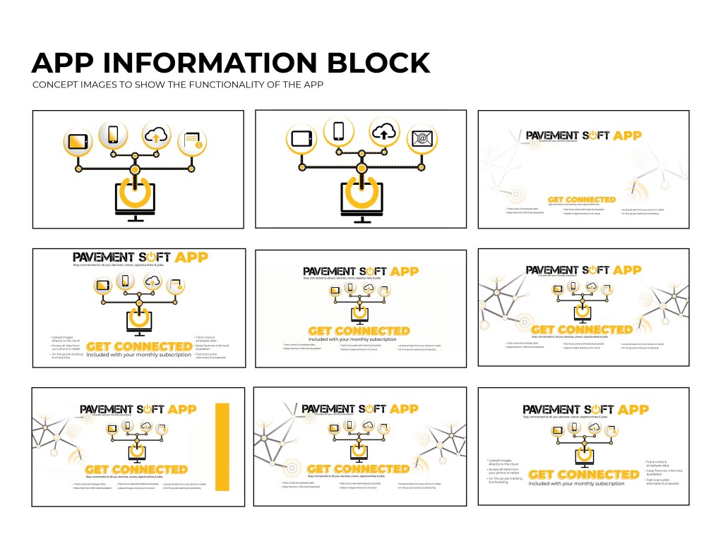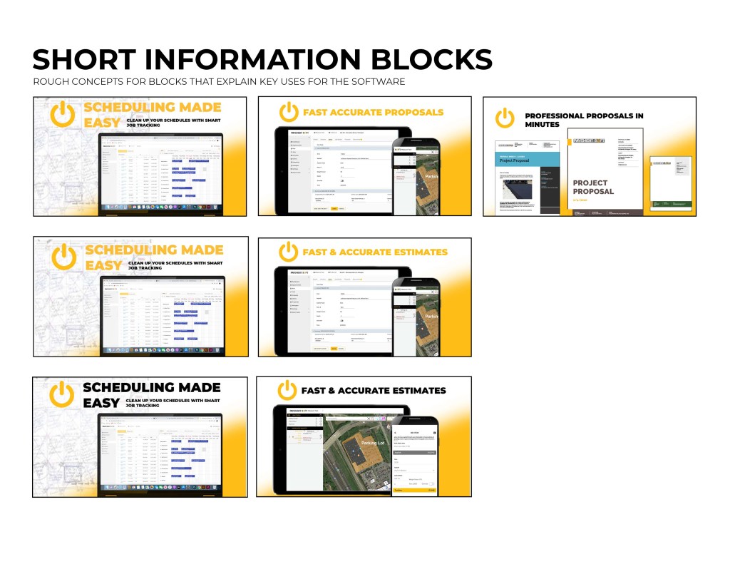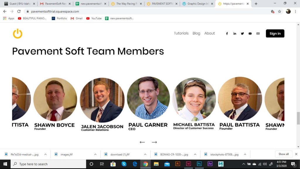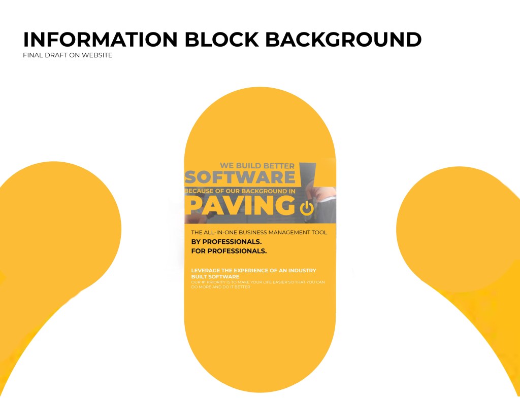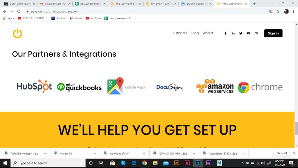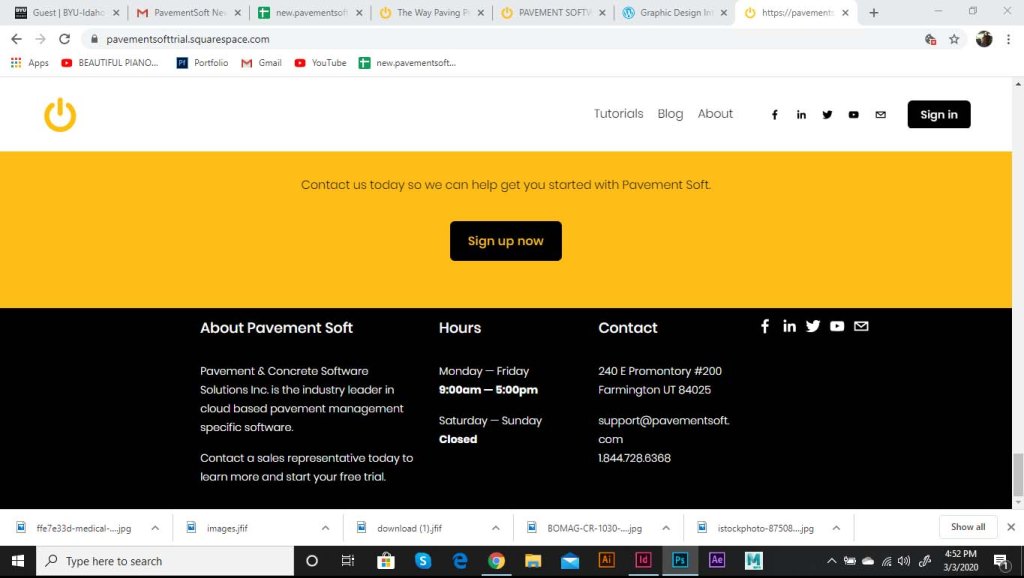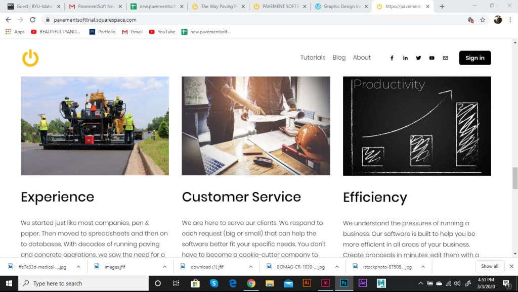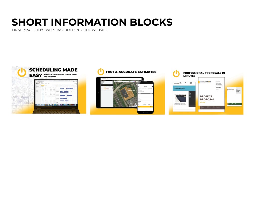 I was asked to start working on a landing page for the software. As part of the website, we wanted to include the logo opening up. The logo was to be animated, and the goal was to show the tech side of the pavement industry. The power logo rolls onto screen like a paving machine. The tic on the power logo then turns it on like a button. This animation is displayed at the top of the landing page. I ran into some trouble with this initially. I had to make it loop so that the video wouldn’t just end and start over in a weird spot. So I had it roll back of screen and the tag lines replace the logo.